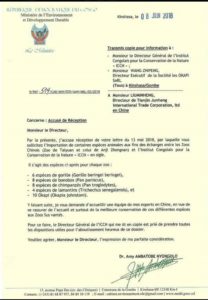 En effet, dans une lettre d’accusée de réception datant du 08 juin, le ministère de l’environnement répondait à monsieur LIUMINHENG directeur de Tianjin Junheng international Trade corporation(l’organisation demandeuse d’espèces animales de la RDC), qu’une équipe d’experts congolais allait être dépêchée en Chine pour se rassurer de l’accueil et de la meilleure conservation de ces différentes espèces en provenance de la République démocratique du Congo. Dans le même document, le ministre de Amy Ambatobe a ensuite demandé au directeur de l’Institut congolais de la conservation de la nature ‘’de prendre des dispositions utiles pour l’aboutissement heureux de ce dossier’’. Le directeur de l’ICCN qui visiblement n’a pas été d’accord avec la demande du ministre a rappelé dans sa réponse datant du 21 juin dernier, la procédure à suivre instituée par la convention CITES (Convention sur le commerce international des espèces de faune et de flore sauvages menacées d’extinction).