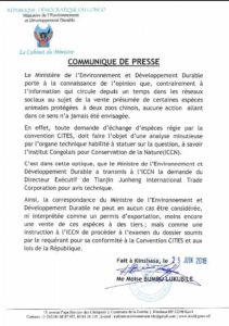 ‘’Le ministère de l’environnement porte a la connaissance de l’opinion que contrairement à ce qui circule sur les réseaux sociaux depuis un temps au sujet de la vente présumée de certaines espèces animales protégées a deux zoos chinois, aucune action allant dans ce sens n’a jamais été envisagée’’ a déclaré le ministère dans un document datant de ce 25 juin 2018.